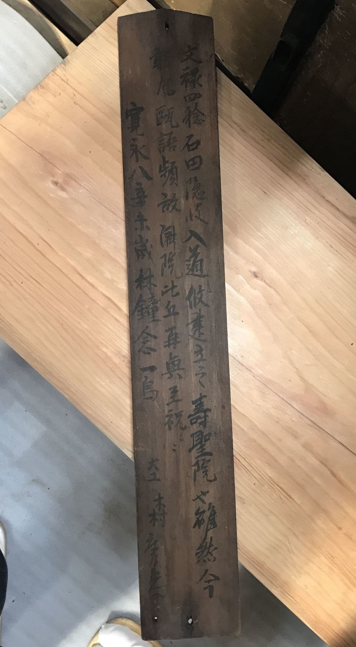 壽聖院では、三成公の父である正継公を描いた石田正継像をはじめとした文化財を所蔵しています。石田正継像は土佐光信もしくはその弟子により描かれたとされ、平成24年5月に国の重要文化財として指定されました。経年の劣化により吊るすのも難しい状態でしたが、2022年12月よりクラウドファンディングを行い、皆様のご支援のおかげで現在修復作業に入っております。
